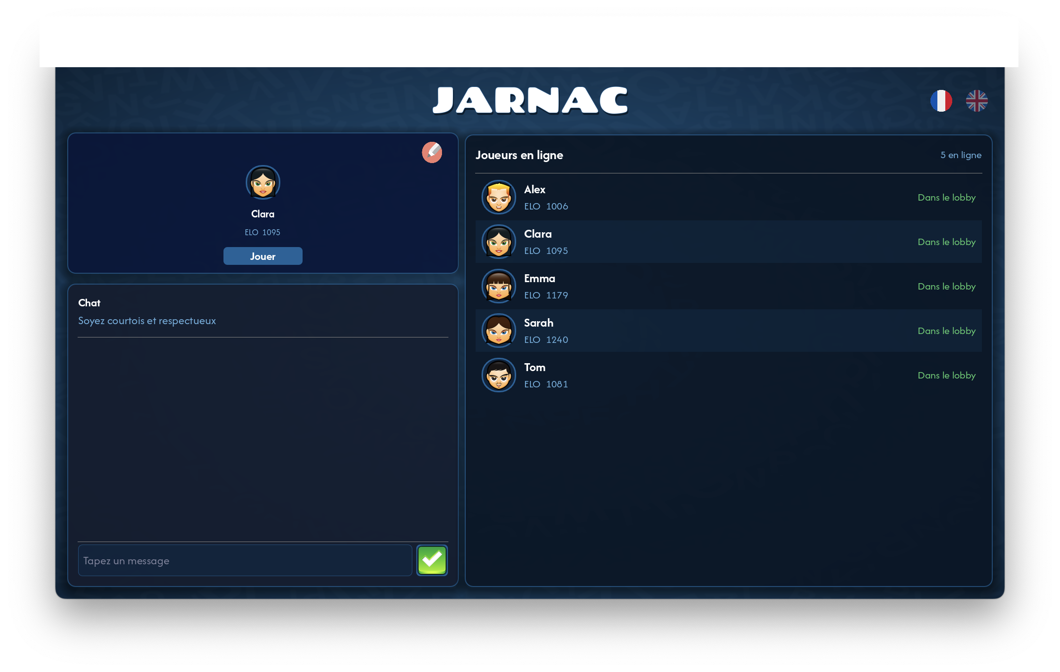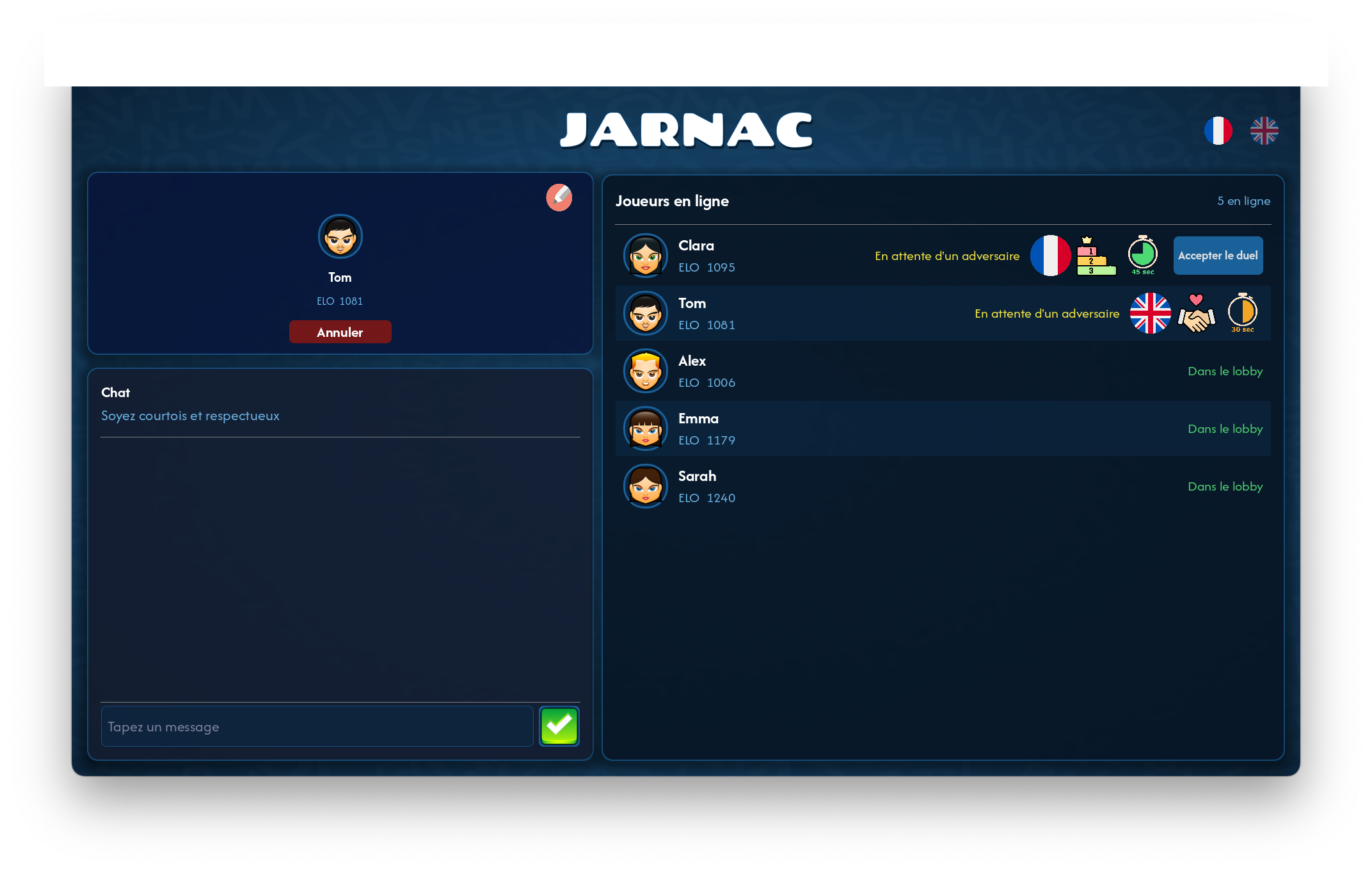 Jarnac is a fast online duel where the steal is the soul of the game. A minute to learn, a lifetime to master — and you're always one blink from losing the word.